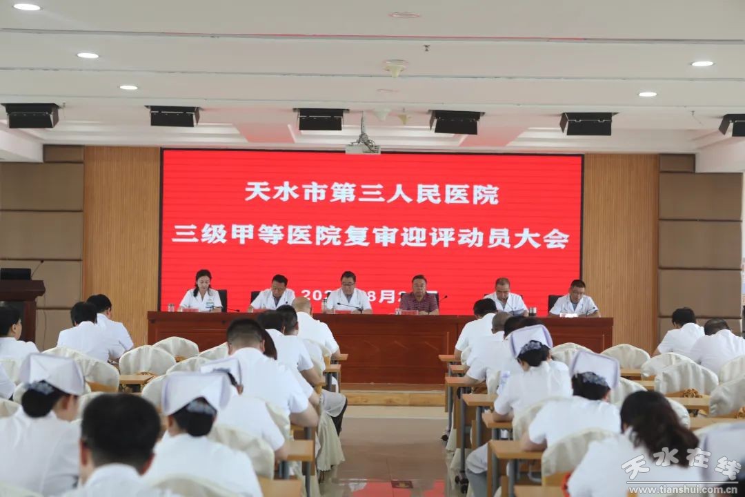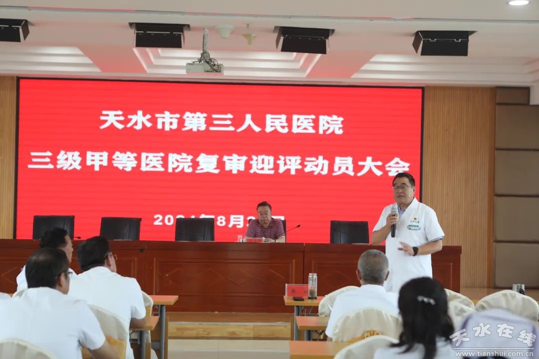 為統(tǒng)一全院職工思想認識、落實評審責任,切實有效推進我院2025年“三甲”復審各項工作,為順利完成等級評審各項任務和醫(yī)院的高質量發(fā)展奠定基礎,2024年8月20日下午,天水市第三人民醫(yī)院等級復審迎評動員大會。院領導、甘肅省強制醫(yī)療所領導及全院中層干部共80余人參加,會議由黨委委員、副院長陳軍明主持。同時邀請到省級醫(yī)院等級評審專家范宗慧做了評審評建工作專題培訓。