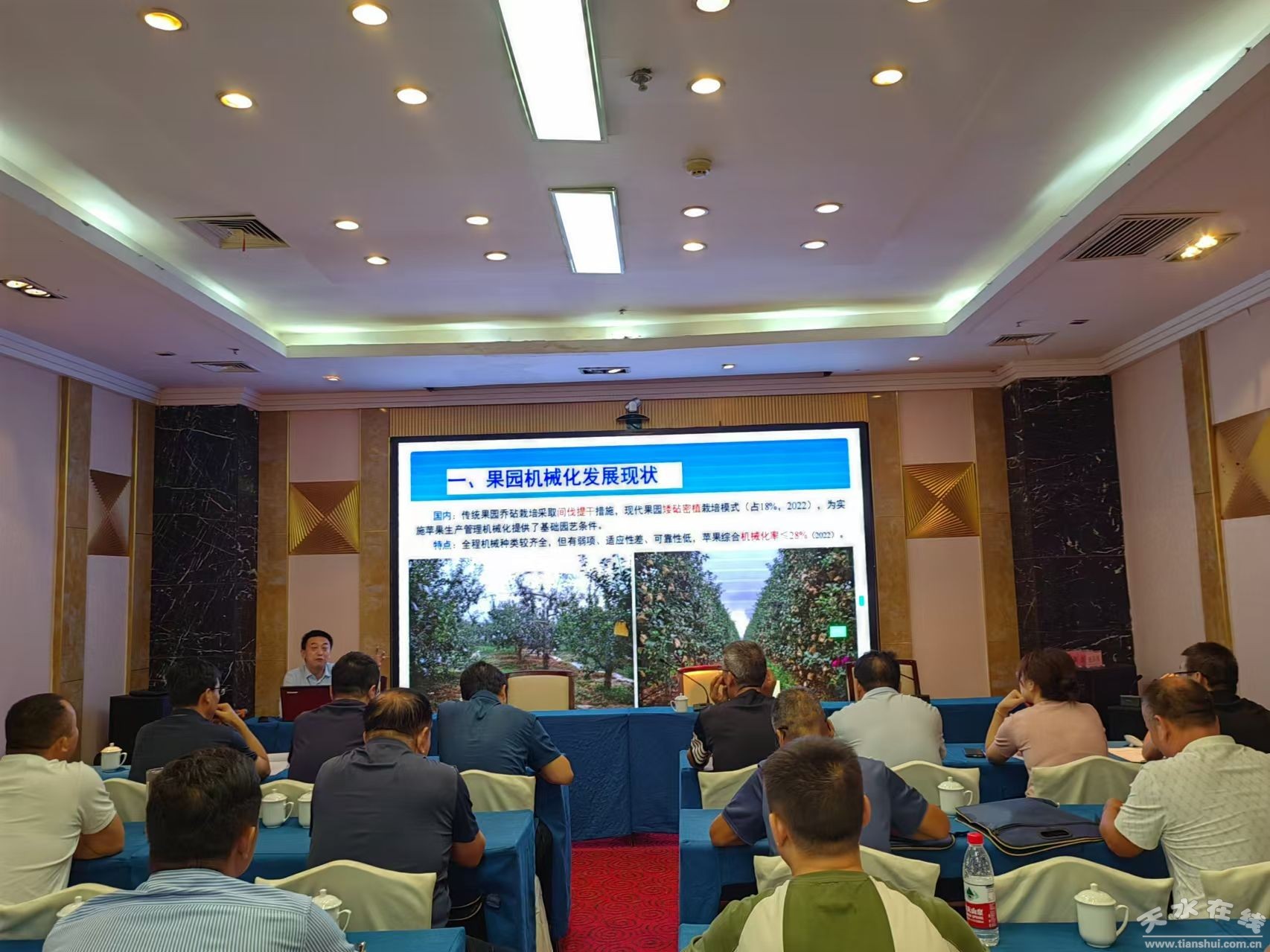 培訓會前,參會人員現(xiàn)場觀摩了秦州區(qū)綠盛果品種植農(nóng)民專業(yè)合作社蘋果種植基地,現(xiàn)場演示講解了懸掛式風送噴霧機、智能割草機、果園開溝機、電動割草機、農(nóng)用升降作業(yè)平臺、植保無人機等果園重點環(huán)節(jié)機具引進、試驗、示范推廣等情況。