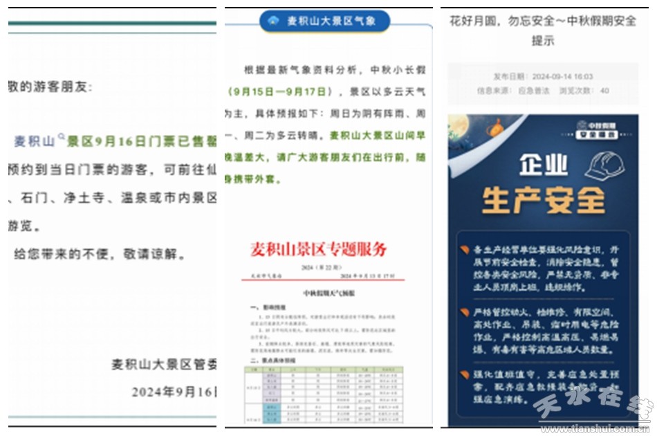 面對中秋客流高峰帶來的管理和服務(wù)壓力,假日期間景區(qū)全面實(shí)行網(wǎng)絡(luò)門票分時(shí)預(yù)約制,通過官方微信、網(wǎng)站、手機(jī)短信、新聞媒體發(fā)布景區(qū)游客容量和票務(wù)預(yù)警信息,引導(dǎo)廣大游客安全、合理、錯(cuò)峰出行,營造了和諧、舒適、安全的旅游環(huán)境,以優(yōu)質(zhì)的服務(wù)開啟了麥積山大景區(qū)佳節(jié)之旅。