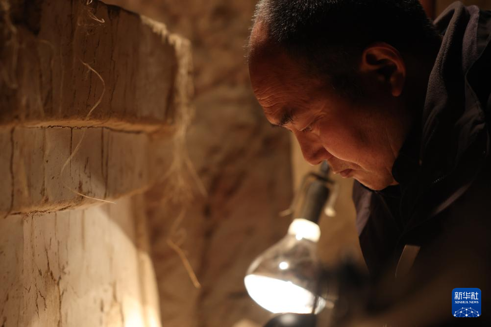 麥積山石窟藝術(shù)研究所文物修復(fù)人員楊志強(qiáng)在麥積山石窟32窟內(nèi)進(jìn)行保護(hù)修復(fù)工作(11月2日攝)。