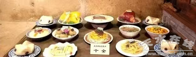 天水傳統(tǒng)名宴“十全”,唐宋期間就己供達(dá)官顯貴享用。據(jù)說名稱出自于明朝皇帝朱元璋,它曾是宮廷貴族享用之菜肴,后傳入民間,逐漸演變成民間紅白喜事或宴客的主菜。通常一座席上有八道涼菜,十道熱菜,這十道熱菜,便叫“十全”。在十全的基礎(chǔ)上再增加兩道熱菜,便叫做“十二樓席”,“十二樓席”上再增加兩道熱菜便成為“樓上樓席”!笆钡牟耸酵ǔJ轻劙l(fā)菜、四喜丸子、八寶雞、八寶飯、天水扣肉、猴戴帽、帶把肘子、雜燴、燒蹄筋、酸辣里脊等,在菜式方面按客人口味有所調(diào)整,但十道熱菜是固定不變的。特別有意思的是,傳統(tǒng)“十全”席里面有一道菜叫“猴戴帽”,把豆角切絲和粉絲焯熟后墊碗底,用油潑辣子、油芝麻、蒜、芥末攪勻,將油炸丸子、過油肉、蒜苔條、油炸豆腐、袈裟肉、烏龍頭、酥肉澆入,看起來像猴子戴著一頂帽子,形象貼切的顯示出別具一格的菜名。
