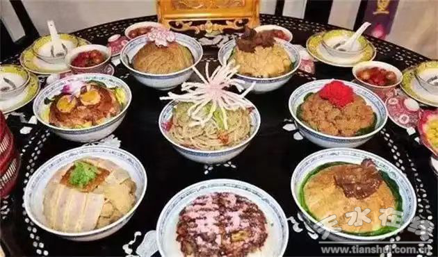 也不知道從哪個朝代哪年開始,在天水,每逢佳節(jié)喜事,親朋聚會,尤其春節(jié)期間,家家戶戶的餐桌上必須備有令人垂涎欲滴的天水扣碗子。天水人認(rèn)為,天水扣碗菜是最正宗的地方菜,它二十余種品種,琳瑯滿目,引人注目。主要有紅燒肉、黃花肉,糟肉、粉蒸肉、蝦醬肉、梅菜扣肉、黃燜雞、黃燜排骨、黃燜肘子、紅燒排骨、紅燒帶魚、八寶飯等各種當(dāng)?shù)貍鹘y(tǒng)名菜。