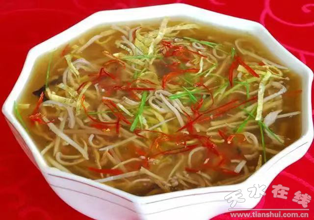 在天水美食中,湯也有講究。說到湯,必說到秦安酸辣肚絲湯。秦安肚絲湯是秦安的一道獨特小吃,又是人人皆知的一道獨特湯料。它制作精細(xì),選用新鮮豬肚清洗干凈,清水下鍋煮熟冷卻,將玉蘭片、菠菜、干辣子切成絲,熱油鍋中用蔥、姜、蒜、干辣子熗鍋,依次加入醋、高湯、芡汁及肚絲、玉蘭片、菠菜,滴上香油,文火燒制。肚絲湯其湯色黃亮,味道酸辣可口,入口既有葷肉的香醇又有素菜的清爽,還兼有麻辣酸香的滋味,之所以能成為秦安的一道獨特小吃,除湯酸辣交集,回沬無窮外,其關(guān)鍵原因是當(dāng)?shù)仫嬎新詭涛兜乃|(zhì)決定了秦安肚絲湯獨特的味覺。在寒冬時節(jié)里,一碗酸辣可口的肚絲湯下肚,曖意瞬間包裹了你的胃口,有一種特別的適意熨帖。