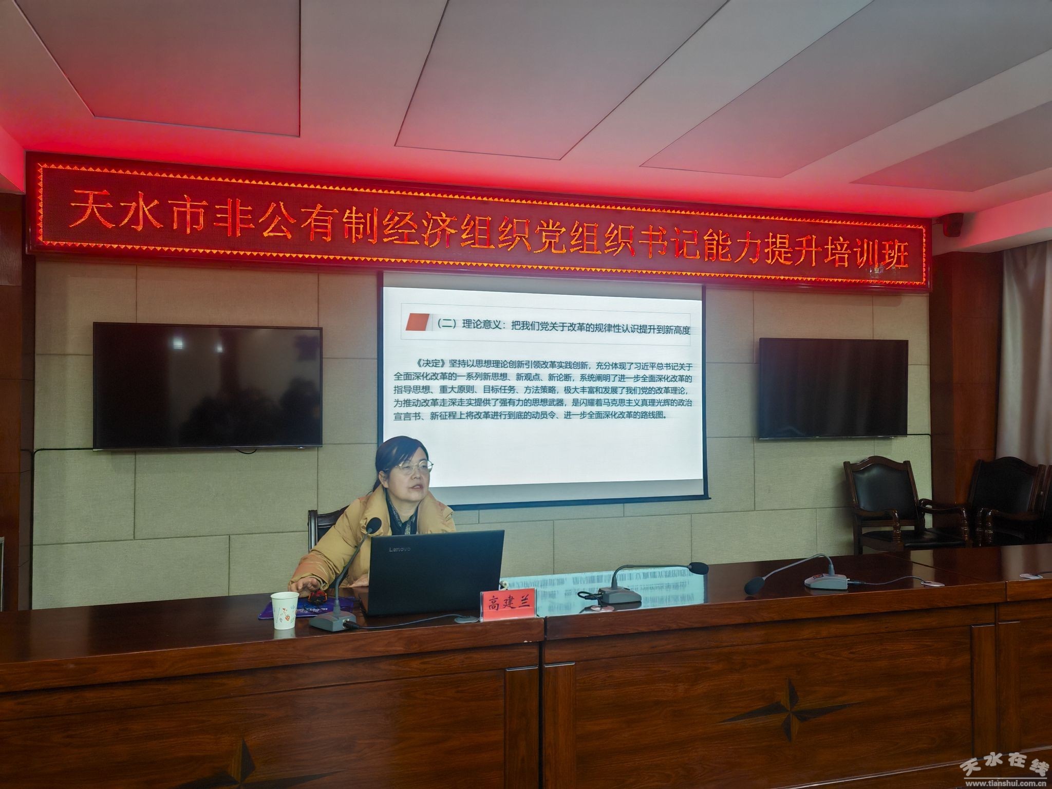 此次培訓(xùn)采取集中授課、觀看視頻、警示教育、交流研討、現(xiàn)場(chǎng)觀摩相結(jié)合的形式,邀請(qǐng)市委政策研究室副主任成雪峰、市委黨校副教授高建蘭等解讀黨的二十屆三中全會(huì)精神和習(xí)近平總書(shū)記視察甘肅重要講話重要指示精神,對(duì)《中國(guó)共產(chǎn)黨章程》《中共中央 國(guó)務(wù)院關(guān)于促進(jìn)民營(yíng)經(jīng)濟(jì)發(fā)展壯大的意見(jiàn)》《非公有制經(jīng)濟(jì)組織黨支部發(fā)揮政治引領(lǐng)作用工作規(guī)范》進(jìn)行培訓(xùn)講解,對(duì)發(fā)展黨員、黨支部標(biāo)準(zhǔn)化建設(shè)等重點(diǎn)工作進(jìn)行了安排部署,現(xiàn)場(chǎng)觀摩了天水市工業(yè)博物館、市市場(chǎng)監(jiān)管局黨建文化中心和兩個(gè)機(jī)關(guān)黨支部標(biāo)準(zhǔn)化建設(shè)示范點(diǎn)。