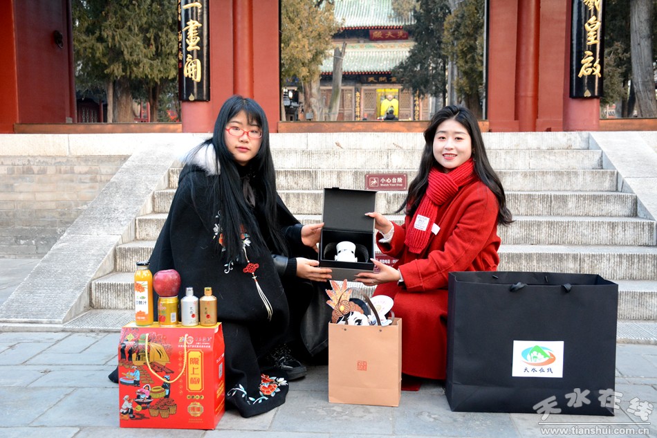 2025年1月1日上午8時,天水市文化和旅游局工作人員向打卡天水伏羲廟的2025年第一位游客(來自西安)頒發(fā)了證書,天水在線向這位幸運游客贈送了大禮包。這個大禮包里面裝有又大又紅的天水花牛蘋果、隴上花牛蘋果汁、清水充國老酒、清水“酸九九”沙棘汁、武山文創(chuàng)產(chǎn)品“鼓娃”、武山水簾洞門票、“隴上椒”甘谷辣椒大禮包、“福禧”杯、只間八卦文創(chuàng)產(chǎn)品等。