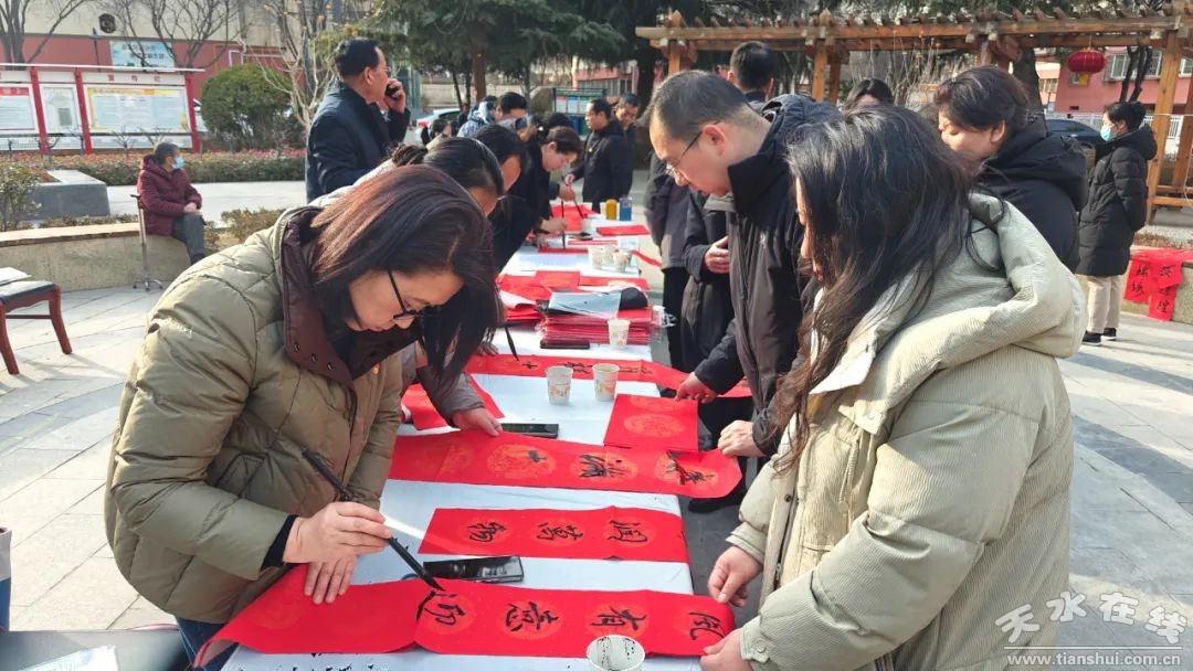 在岷山社區(qū)安居小區(qū)文化廣場由市書協(xié)書法家們?yōu)樯鐓^(qū)居民書寫春聯(lián)、“福”字200余幅,將美好的新春祝福送到岷山社區(qū)黨員干部和社區(qū)居民手中。各位書法家揮毫潑墨,一幅幅遒勁有力的春聯(lián)和福字躍然紙上,每幅春聯(lián)、每個(gè)“!弊诛柡鴮γ篮蒙畹淖8#瑸榧磳⒌絹淼囊宜壬吣晷麓杭压(jié)增添了濃厚的文化氣息和藝術(shù)氛圍,社區(qū)群眾現(xiàn)場欣賞著書法家飽含深情的筆墨,臉上滿是喜悅之情,廣場上充滿歡聲笑語,處處洋溢著結(jié)對共建單位之間親如一家、共迎新春佳節(jié)的共同心愿。