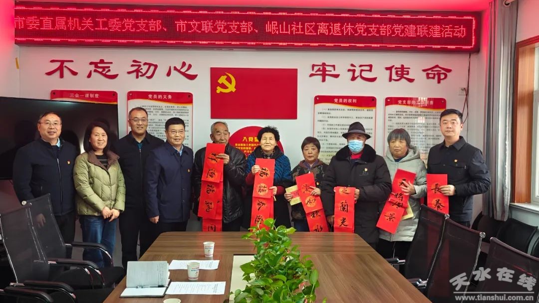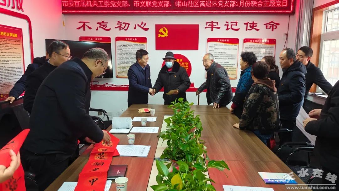 1月21日,市委直屬機(jī)關(guān)工委、市文聯(lián)和秦州區(qū)岷山社區(qū)離退休黨支部聯(lián)合開展以“黨建引領(lǐng)服務(wù)基層,共建互助喜迎新春”為主題的黨建聯(lián)建暨1月份主題黨日活動。市委直屬機(jī)關(guān)工委和市文聯(lián)現(xiàn)場慰問5名岷山社區(qū)離退休黨支部老黨員和困難黨員,市委直屬機(jī)關(guān)工委、市文聯(lián)、岷山社區(qū)離退休黨支部部分黨員和社區(qū)居民共100余人參加了聯(lián)建聯(lián)誼活動。
