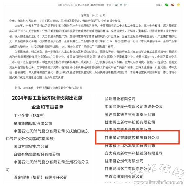 近日,甘肅省人民政府發(fā)布《關(guān)于表?yè)P(yáng)2024年度全省工業(yè)經(jīng)濟(jì)穩(wěn)增長(zhǎng)突出貢獻(xiàn)企業(yè)的通報(bào)》,甘肅星火智能數(shù)控機(jī)床有限公司憑借在工業(yè)產(chǎn)值增長(zhǎng)、技術(shù)創(chuàng)新及產(chǎn)業(yè)帶動(dòng)等方面的卓越表現(xiàn),受到通報(bào)表?yè)P(yáng),榮獲“2024年度全省工業(yè)經(jīng)濟(jì)穩(wěn)增長(zhǎng)突出貢獻(xiàn)企業(yè)”稱號(hào)。