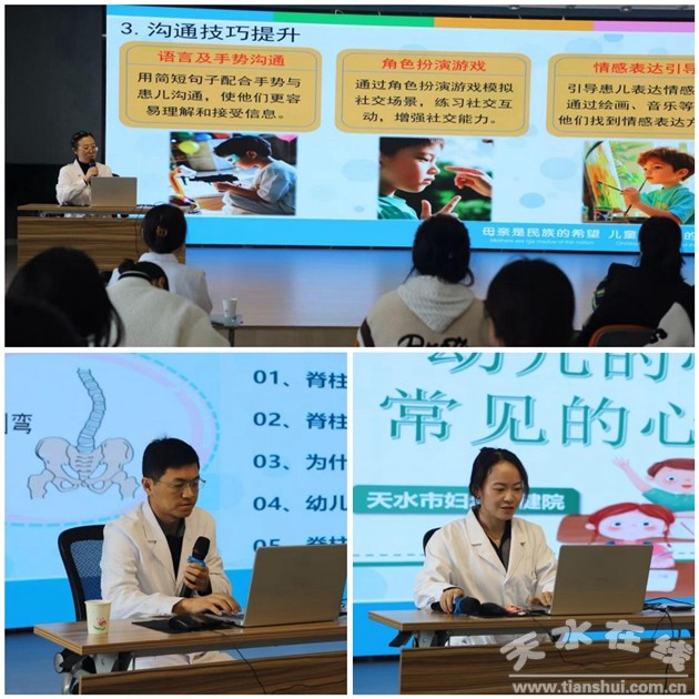 兒童保健科副主任馬偉通過(guò)生動(dòng)形象的圖片和案例,向老師們講解了脊柱側(cè)彎的定義、危害、成因及預(yù)防措施,F(xiàn)場(chǎng)演示了正確的坐姿、站姿等,并帶領(lǐng)老師們進(jìn)行簡(jiǎn)單的脊柱保健操練習(xí)。兒童保健科心理治療師、心理咨詢師李毅敏針對(duì)幼兒常見(jiàn)的心理行為問(wèn)題,如分離焦慮、任性、攻擊性行為等,為老師們進(jìn)行了深入淺出的講解。通過(guò)游戲互動(dòng)、角色扮演等方式,讓老師們引導(dǎo)幼兒學(xué)習(xí)情緒管理、人際交往等技能,促進(jìn)幼兒心理健康發(fā)展。兒童康復(fù)科負(fù)責(zé)人李昌鳳用通俗易懂的語(yǔ)言,向老師們介紹了兒童康復(fù)科的基本職能和常見(jiàn)疾病的康復(fù)治療方法,包括孤獨(dú)癥的早期識(shí)別、幼兒注意缺陷多動(dòng)障礙、幼兒語(yǔ)言發(fā)育遲緩、構(gòu)音障礙及XO型腿健康科普。通過(guò)實(shí)物展示和互動(dòng)體驗(yàn),讓老師們對(duì)康復(fù)治療有了更直觀的認(rèn)識(shí),消除了對(duì)康復(fù)治療的恐懼和誤解。