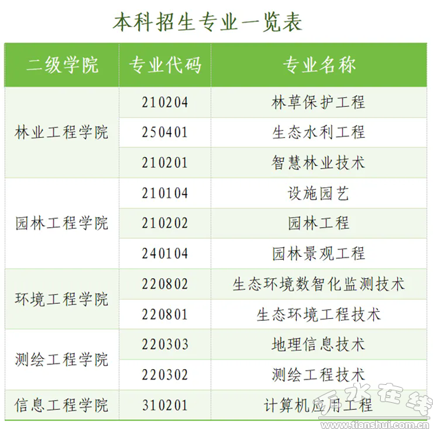 學(xué)校現(xiàn)有麥積校區(qū)(校本部)和清水校區(qū)兩個校區(qū),占地面積共1075.85畝,建筑面積31.23萬平方米;建有10個實習(xí)實訓(xùn)場館,205個校內(nèi)實驗實訓(xùn)室(基地),在麥積山建有3700畝的實習(xí)林場,在清水建有1700畝的實習(xí)農(nóng)場,校企聯(lián)建校外實訓(xùn)基地380余處,圖書館藏書106萬冊。設(shè)10個二級學(xué)院,開設(shè)11個本科專業(yè)、40個?茖I(yè),涵蓋生態(tài)保護(hù)、智慧林業(yè)、環(huán)境監(jiān)測、測繪技術(shù)、現(xiàn)代農(nóng)業(yè)等領(lǐng)域,其中國家示范專業(yè)4個、省級特色專業(yè)7個。