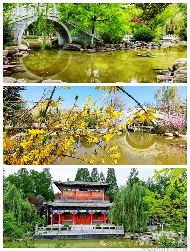 甘林職大,職教之秀也。庠序勝概,萃于校西之沁園。沁者潤也,更承詞韻。園筑于丁酉,廣十有九畝。納丘壑之靈,融教化之理,匠心獨運,予春臨感而記之。