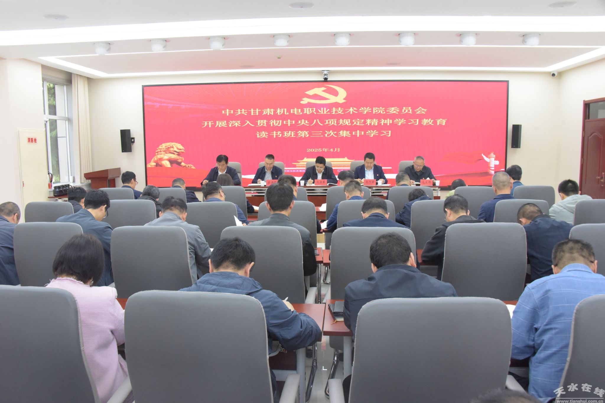 4月23日,學(xué)校開展深入貫徹中央八項規(guī)定精神學(xué)習(xí)教育讀書班第三次集中學(xué)習(xí),認(rèn)真學(xué)習(xí)了《習(xí)近平關(guān)于加強黨的作風(fēng)建設(shè)論述摘編》中<持續(xù)深化糾治“四風(fēng)”><堅持正風(fēng)肅紀(jì)反腐相貫通>篇目。黨委書記趙彥軍主持并講話。在家校領(lǐng)導(dǎo)、全體中層干部正職參會學(xué)習(xí)。