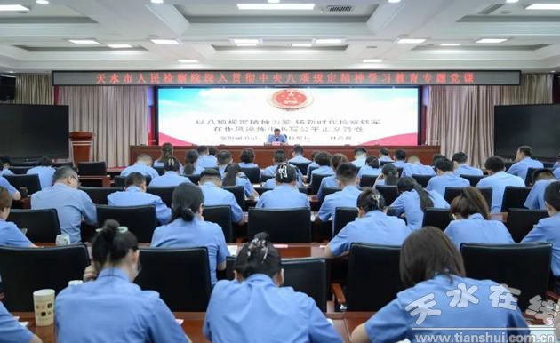 6月27日,天水市人民檢察院黨組副書記、常務副檢察長杜彥群以《以中央八項規(guī)定精神為鑒 鑄新時代檢察鐵軍在作風淬煉中書寫公平正義答卷》為題,為全體檢察人員講授深入貫徹中央八項規(guī)定精神學習教育專題黨課,進一步增強廣大干警的紀律意識和規(guī)矩意識,推動學習教育走深走實。