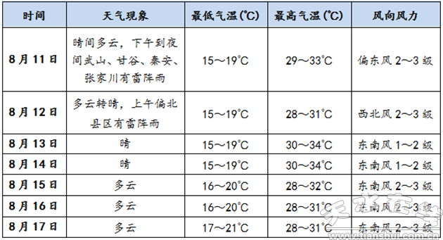 預計未來一周全市以晴或多云天氣為主,其中11日下午~12日上午有雷陣雨,局地伴有8級以上雷暴大風。氣溫預報以秦州區(qū)為例,日最低氣溫18~21℃,日最高氣溫31~33℃。