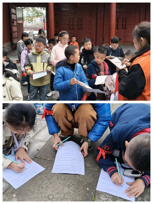 尋寶環(huán)節(jié)成為全場高潮。青少年們分成小組,手持“線索卡”與“偵探手冊”開啟尋寶任務:根據(jù)線索定位對應匾聯(lián),不僅要記錄匾聯(lián)文字,還需手繪簡易圖案留存發(fā)現(xiàn)。尋寶過程中,各組分工協(xié)作、熱烈研討,展現(xiàn)出極強的團隊凝聚力。