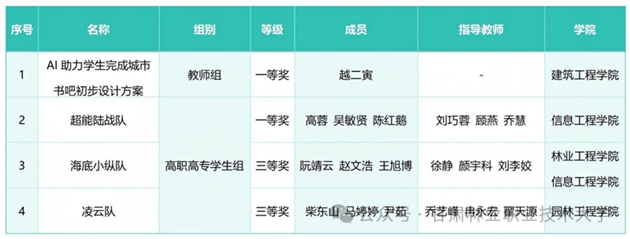在省賽中,建筑工程學(xué)院越二寅老師的微課作品《AI助力學(xué)生完成城市書吧初步設(shè)計(jì)方案》獲教師組一等獎(jiǎng);高職學(xué)生組中,信息工程學(xué)院“超能陸戰(zhàn)隊(duì)”團(tuán)隊(duì)斬獲一等獎(jiǎng),林業(yè)工程學(xué)院“海底小縱隊(duì)”、園林工程學(xué)院“凌云隊(duì)”兩支團(tuán)隊(duì)榮獲三等獎(jiǎng)。