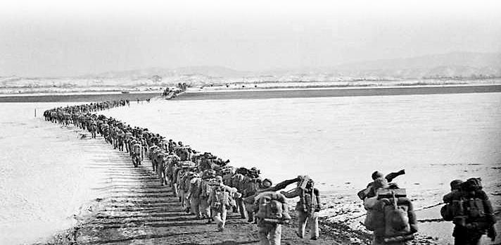 1950年10月,抗美援朝志愿軍隊(duì)伍雄赳赳、氣昂昂跨過(guò)鴨綠江。 新華社發(fā)