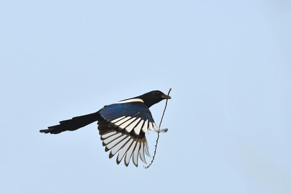 在山東省滕州市西崗鎮(zhèn),喜鵲叼著樹枝準(zhǔn)備筑巢。新華社發(fā)(李志軍攝)