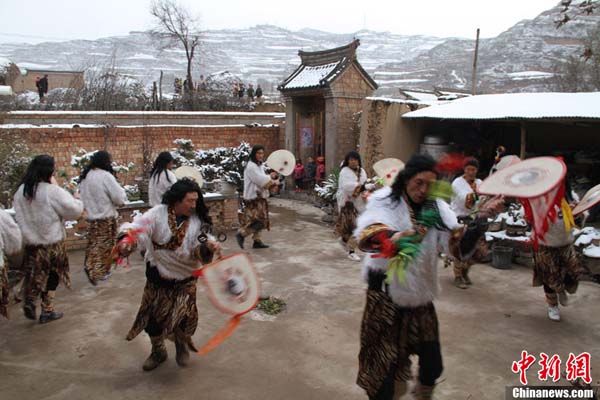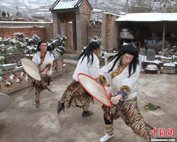 冬日起伏連綿的雪山下,高亢鏗鏘的鼓點(diǎn)震撼人心。甘肅武山縣灘歌鎮(zhèn)戴家溝村村民戴思賢的院落內(nèi),村民們正在表演旋鼓舞,長辮、羊皮大襖、獸皮裹腿、狂野的舞步,令人恍若回到遠(yuǎn)古。旋鼓舞流傳于甘肅天水及周邊地區(qū),已有4000多年歷史,是古羌族人在此長期農(nóng)牧生活中遺留下來的舞蹈,其以娛神、娛人為內(nèi)容,以舞蹈、祭祀活動(dòng)為載體,涵蓋歷史、宗教、民俗、藝術(shù)等諸多文化。張道正 攝