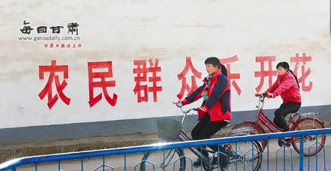 人們騎車從“農(nóng)民群眾樂開花”的標(biāo)語(yǔ)前走過(guò)。雙聯(lián)行動(dòng)為北順村農(nóng)民帶來(lái)了實(shí)惠,農(nóng)民群眾對(duì)這一富民行動(dòng)喜在眉梢,樂在心頭。