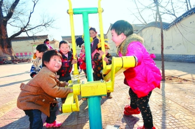 幾名小朋友在村文化廣場(chǎng)的健身器材上玩耍。北順村如今擁有多種健身器械,勞動(dòng)之余,健身成為農(nóng)民的新時(shí)尚。