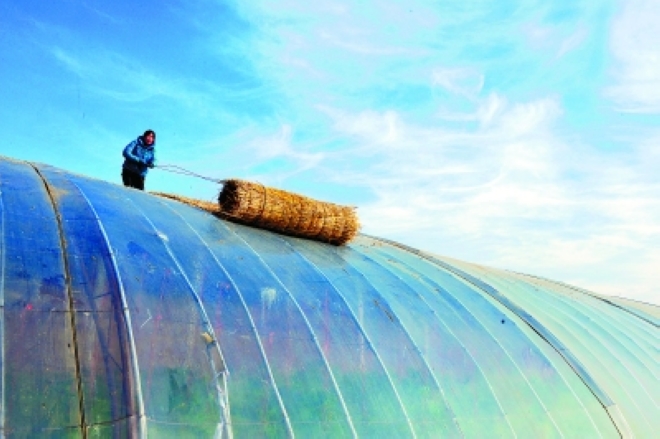 一農(nóng)民卷起溫室大棚的保暖草簾。目前,北順村蔬菜種植面積達(dá)1900余畝,成為武山縣最大的蔬菜生產(chǎn)基地之一。