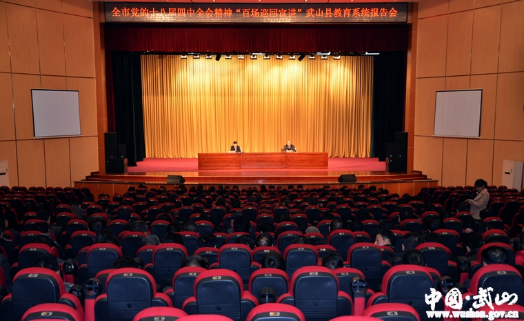 12月23日,全市黨的十八屆四中全會(huì)精神“百場(chǎng)巡回宣講”武山縣教育系統(tǒng)報(bào)告會(huì)在縣文化中心禮堂舉行。報(bào)告邀請(qǐng)市公安局政治部主任王蘭平主講,教體局領(lǐng)導(dǎo)班子全體成員、全縣完全小學(xué)以上學(xué)校校長(zhǎng)、書記,城區(qū)中小學(xué)校所有班子成員,教體局機(jī)關(guān)各股室負(fù)責(zé)人共計(jì)300余人聆聽(tīng)宣講。