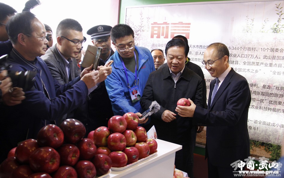10月20日上午,2016年天水花牛蘋果宣傳推介活動(dòng)在天水市麥積區(qū)盛達(dá)廣場隆重開幕?h委副書記、縣長馬勤學(xué),縣政府黨組成員、副縣長候選人令軍強(qiáng)參加推介活動(dòng)并參觀武山縣展館。此次,武山縣共展出花牛系列蘋果50余種,艷果紅(黑梨)、花椒、核桃等特色果品10余種。