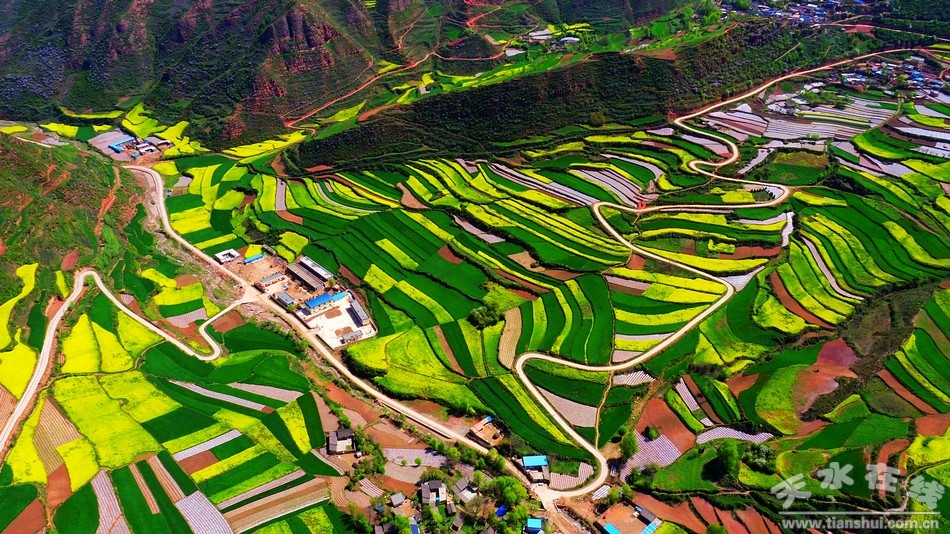 五月初夏,武山縣馬力鎮(zhèn)處處生翠、生意闌珊,丁香花、梨花兒以及那些不知名的小花,花期正盛,在初夏的陽光里更顯綿綿詩意、勃勃生機(jī)。然而,最耀眼的,要數(shù)那沿著綿延的梯田,錦緞般鋪開,層層疊疊盛放的油菜花。5月4日,天水在線航拍小組走進(jìn)鐘山村和民武村,開啟了一場勝日尋芳的絕美歷程。