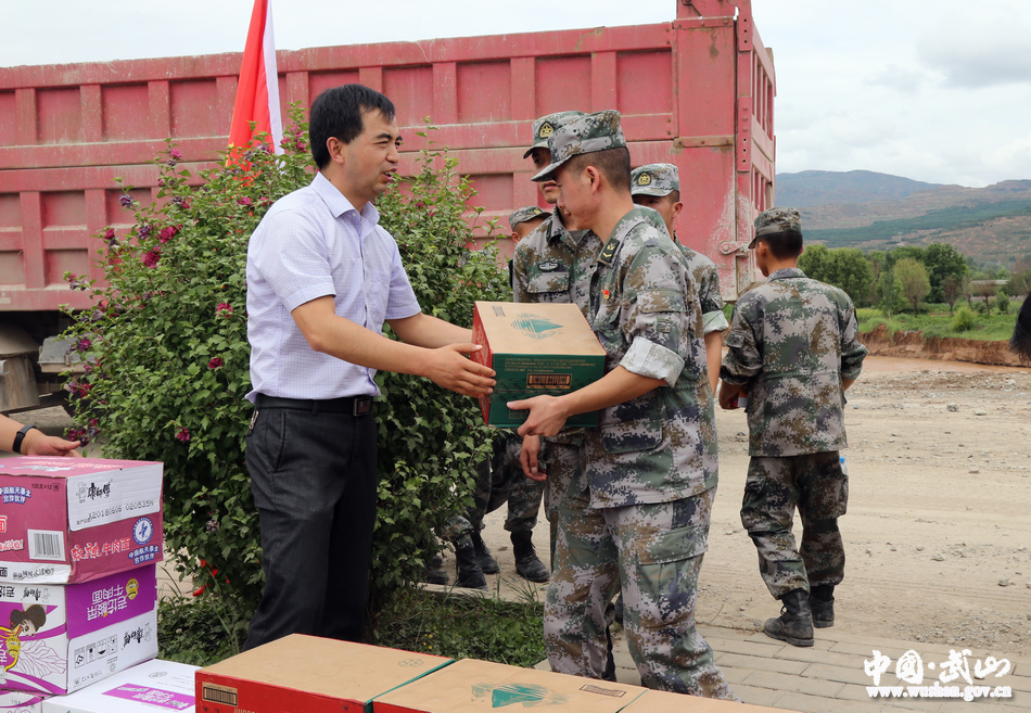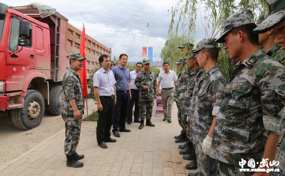 7月5日,縣委常委、政法委書記王志軍,縣政府副縣長李康寧深入武山大道洛門鎮(zhèn)孟莊水毀路段等受災(zāi)現(xiàn)場,看望慰問奮戰(zhàn)在抗洪搶險救災(zāi)一線的解放軍指戰(zhàn)員、武警部隊官兵、公安消防戰(zhàn)士,代表縣委、縣政府以及50萬武山人民向他們致以誠摯的問候和衷心的感謝,并為他們送上了慰問品?h人武部部長黃峰一同看望。