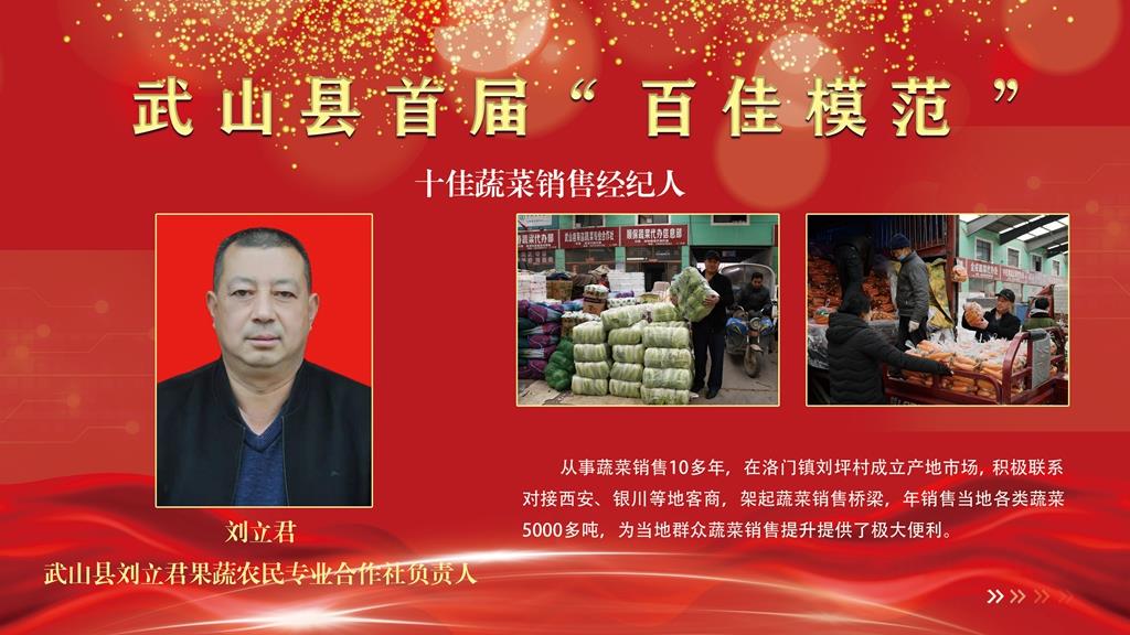 劉立君 武山縣劉立君果蔬農(nóng)民專業(yè)合作社負(fù)責(zé)人。從事蔬菜銷售10多年,在洛門鎮(zhèn)劉坪村成立產(chǎn)地市場,積極聯(lián)系對接西安、銀川等地客商,架起蔬菜銷售橋梁,年銷售當(dāng)?shù)馗黝愂卟?000多噸,為當(dāng)?shù)厝罕娛卟虽N售提升提供了極大便利。