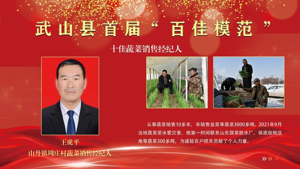 王虎平 山丹鎮(zhèn)周莊村蔬菜銷售經(jīng)紀(jì)人。從事蔬菜銷售10多年,年銷售韭菜等蔬菜3000多噸。2021年9月當(dāng)?shù)厥卟耸鼙?zāi)害,他第一時間聯(lián)系山東蔬菜脫水廠,保底收購豆角等蔬菜300多噸,為減輕農(nóng)戶損失貢獻(xiàn)了個人力量。
