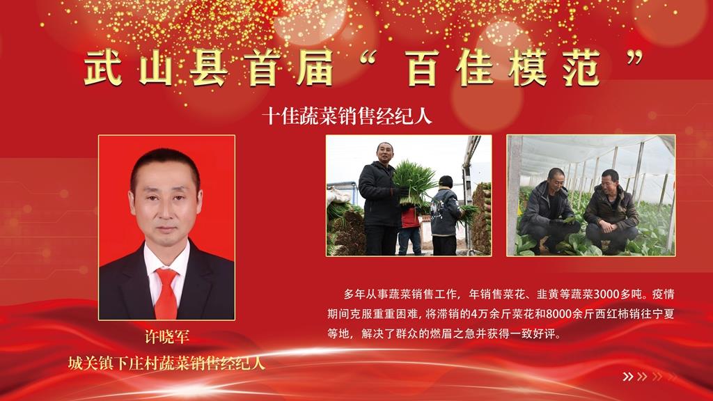 許曉軍 城關(guān)鎮(zhèn)下莊村蔬菜銷售經(jīng)紀(jì)人。多年從事蔬菜銷售工作,年銷售菜花、韭黃等蔬菜3000多噸。疫情期間克服重重困難,將滯銷的4萬余斤菜花和8000余斤西紅柿銷往寧夏等地,解決了群眾的燃眉之急并獲得一致好評。