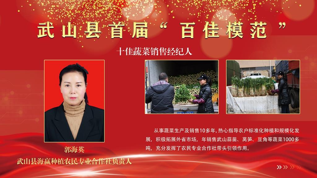 郭海英 武山縣海贏種植農(nóng)民專業(yè)合作社負(fù)責(zé)人。從事蔬菜生產(chǎn)及銷售10多年,熱心指導(dǎo)農(nóng)戶標(biāo)準(zhǔn)化種植和規(guī);l(fā)展,積極拓展外省市場,年銷售武山蒜苗、萵筍、豆角等蔬菜1000多噸,充分發(fā)揮了農(nóng)民專業(yè)合作社帶頭引領(lǐng)作用。