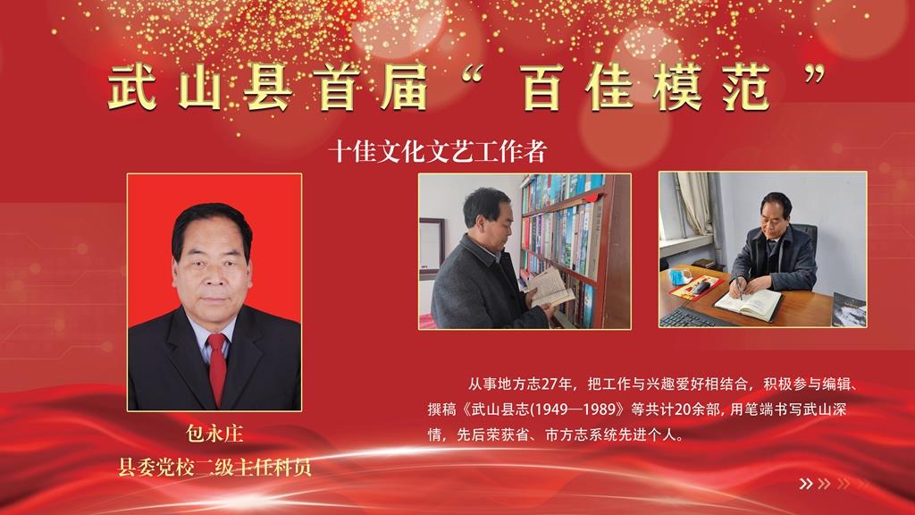 包永莊,縣委黨校二級主任科員。從事地方志27年,把工作與興趣愛好相結(jié)合,積極參與編輯、撰稿《武山縣志(1949—1989)》等共計20余部,用筆端書寫武山深情,先后榮獲省、市方志系統(tǒng)先進(jìn)個人。