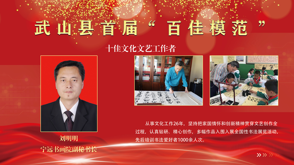 劉明明,寧遠(yuǎn)書畫院副秘書長。從事文化工作26年,堅(jiān)持把家國情懷和創(chuàng)新精神貫穿文藝創(chuàng)作全過程,認(rèn)真鉆研、精心創(chuàng)作,多幅作品入圍入展全國性書法展覽活動,先后培訓(xùn)書法愛好者1000余人次。