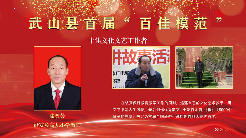 編者按:2021年,武山縣堅(jiān)持以習(xí)近平新時代中國特色社會主義思想為指導(dǎo),緊扣“三新一高”的要求,大力培育和踐行社會主義核心價值觀,涌現(xiàn)出了一大批作出新貢獻(xiàn)、取得新業(yè)績、展現(xiàn)新風(fēng)貌的先進(jìn)典型。為樹立典型、弘揚(yáng)正氣、凝聚力量,引導(dǎo)和激勵廣大干部群眾向先進(jìn)模范學(xué)習(xí),爭做崇高道德的踐行者、文明風(fēng)尚的維護(hù)者、美好生活的創(chuàng)造者,縣委宣傳部、縣融媒體中心聯(lián)合推出【百佳模范】專題欄目,全面展示“百佳模范”先進(jìn)事跡和感人故事,為加快建設(shè)經(jīng)濟(jì)繁榮、城鄉(xiāng)美麗、生態(tài)宜居、治理高效、人民幸福的現(xiàn)代化新武山凝聚強(qiáng)大的精神動力。
