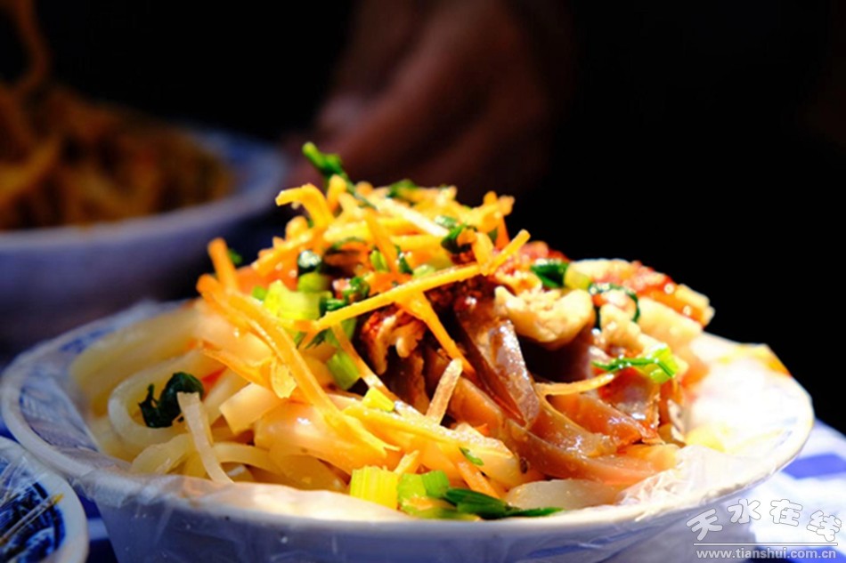 在渭川特色美食展銷品鑒活動中,武山油圈圈、韭盒、油餅、油煎洋芋、洋芋餅、燴菜、甜胚子、粽子、涼粉、釀皮等美食一一亮相,勾引起游客的味蕾,贏得大家的點贊!拔液薏坏冒堰@里所有的美食都品嘗一遍!奔钨e張先生品嘗了武山韭盒和釀皮后,贊嘆不已,并表示回家要帶一些油圈圈、油餅等美食,讓家人和朋友品嘗。