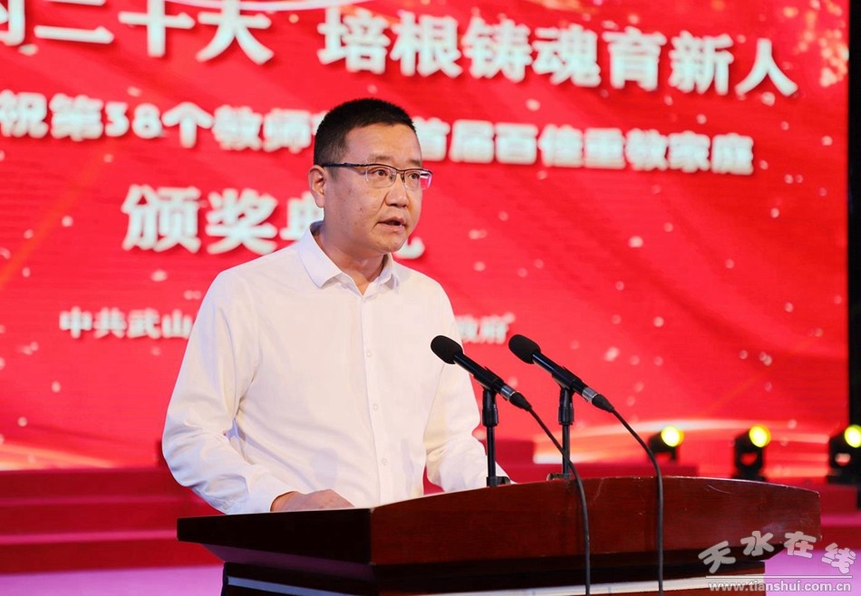 武山縣融媒體中心9月9日訊 (記者 康正東 董世雄 管秋勇 楊彥春)9月9日,武山縣舉行慶祝第38個(gè)教師節(jié)暨首屆百佳重教家庭頒獎(jiǎng)典禮,縣委書記王新強(qiáng),縣委副書記、縣長(zhǎng)王志成,縣人大常委會(huì)主任孫德銀,縣政協(xié)主席龐明全出席頒獎(jiǎng)典禮并為百佳重教家庭、“十佳”重教支教單位、教育工作百佳單位和個(gè)人、優(yōu)秀教師代表頒獎(jiǎng)。