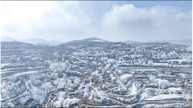 近日,甘肅省天水市武山縣榆盤鎮(zhèn)一夜之間雪落霜凝,呈現(xiàn)出別樣的霧凇云海美景。