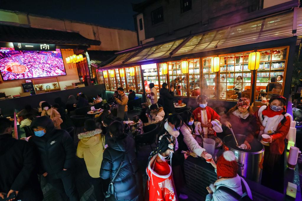 1月21日晚,四川成都寬窄巷子的市民和游客通過大屏幕看春晚。新華社記者 沈伯韓 攝