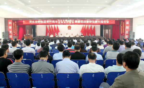 6月16日,全市紀念建黨90周年先進基層黨組織和優(yōu)秀共產黨員先進事跡巡回宣講團在張家川作宣講報告?h四大組織在家領導,縣委中心組成員、各鄉(xiāng)鎮(zhèn)、縣直及駐縣市屬各單位副科級以上干部及部分單位干部代表共400余人聆聽了宣講報告,縣委常委、宣傳部長陳鴻主持報告會。
