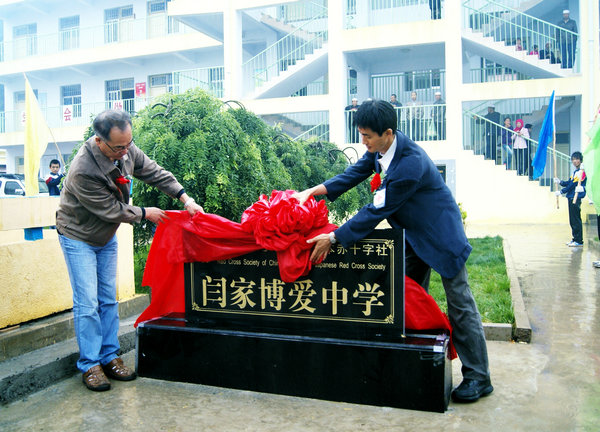 位坂和隆與袁博一同為閆家中學(xué)揭牌
