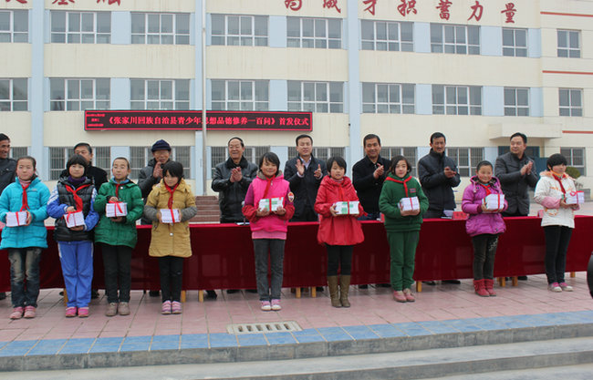 11月27日,在張川鎮(zhèn)東街小學舉辦首發(fā)儀式上,由張家川縣關工委面向全縣青少年編撰的《張家川縣青少年思想品德修養(yǎng)一百問》一書首次出版發(fā)行,共為廣大老師和同學們發(fā)放該書1000冊。