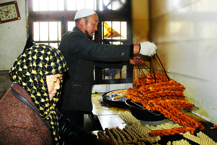 “今年是張家川60周年縣慶。10年前,我家的麻花因為縣慶賺足了人氣。10年后,在人人都在說‘中國夢’的今天,我也有自己的‘中國夢’,那就是抓住60周年縣慶機遇,注冊商標,擴大經(jīng)營規(guī)模,借著縣上發(fā)展清真餐飲業(yè)的東風,讓更多的人品嘗到美味的張家川清真小吃,讓自家包裝精美、質量考究的麻花禮盒成為城市名片,吸引更多的客人來張家川做客!瘪R木目說著自己的心愿,夾著鍋里的麻花,不知不覺,作坊案板上已經(jīng)堆滿了金黃噴香的麻花,一根根精致玲瓏,盈盈養(yǎng)眼。
