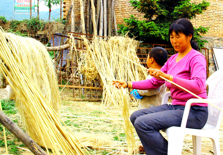 (馬鹿鄉(xiāng)花園村農(nóng)民憲栓蓮從去年收獲的麻桿上剝離麻皮)