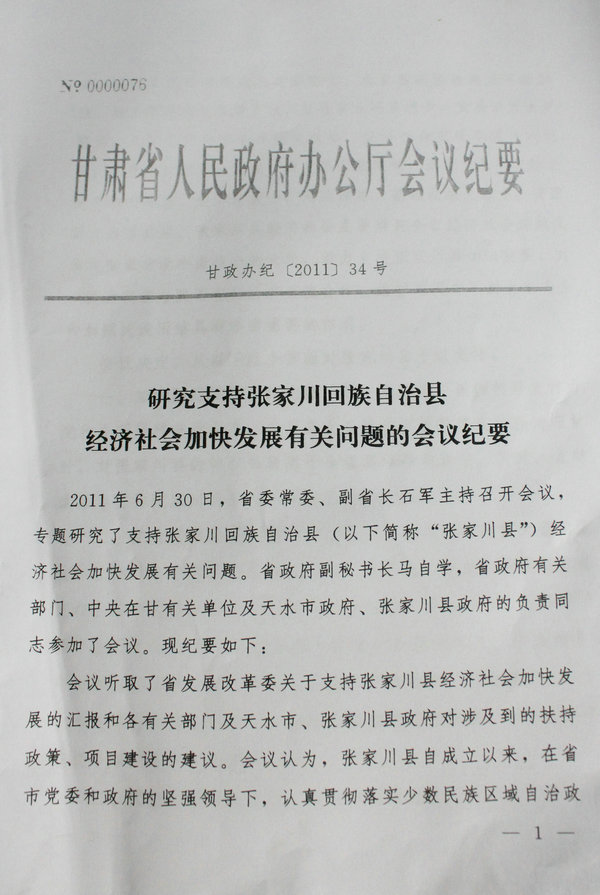(一)省政府出臺了《支持張家川回族自治縣經(jīng)濟(jì)社會加快發(fā)展有關(guān)問題的會議紀(jì)要》。2011年6月30日,原省委常委、副省長石軍主持召開會議,專題研究了支持張家川回族自治縣經(jīng)濟(jì)社會加快發(fā)展有關(guān)問題,并下發(fā)了《會議紀(jì)要》,從轉(zhuǎn)移支付、擴(kuò)大投資、扶貧開發(fā)、基礎(chǔ)設(shè)施、生態(tài)環(huán)境、產(chǎn)業(yè)發(fā)展、社會事業(yè)等7個方面提出了16條支持政策。