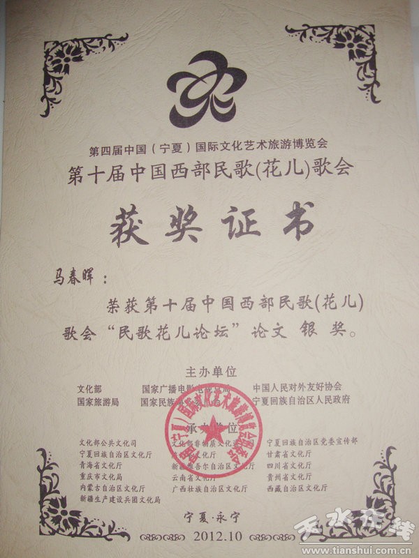 馬春暉榮獲第十屆中國西部民歌(花兒)歌會(huì)“民歌花兒論壇”論文銀獎(jiǎng)