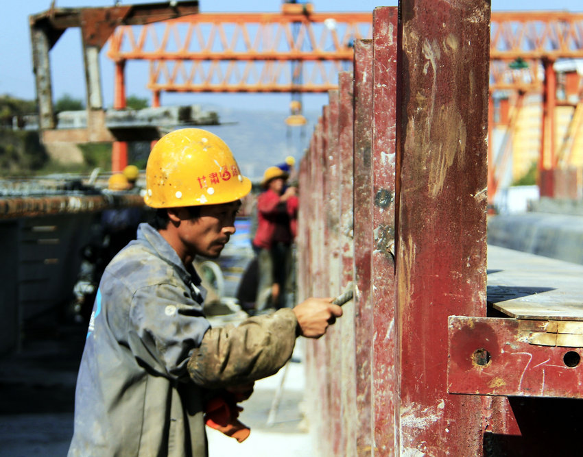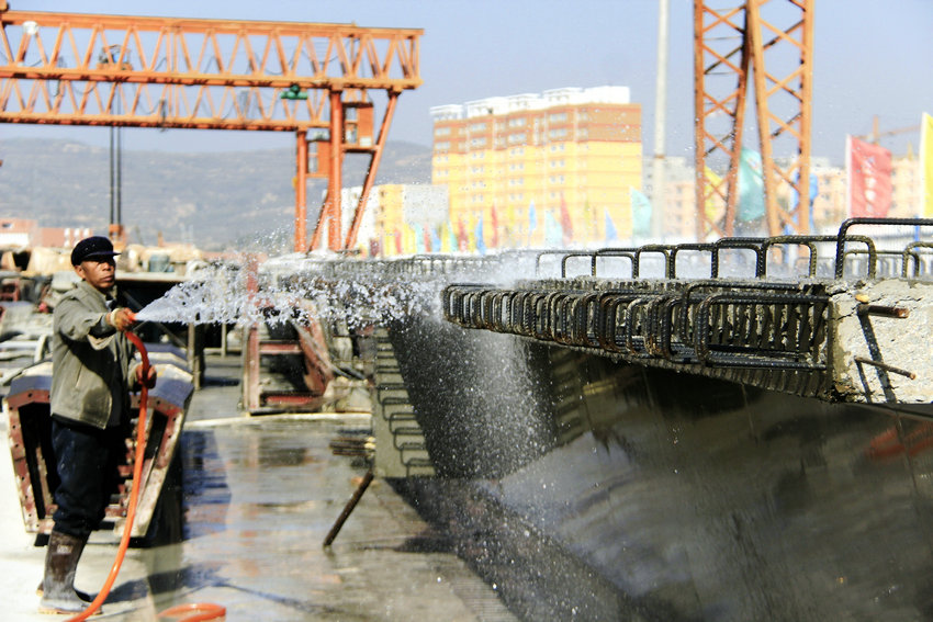 ▲工人們在三集中生產(chǎn)基地加工箱梁
