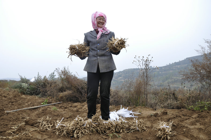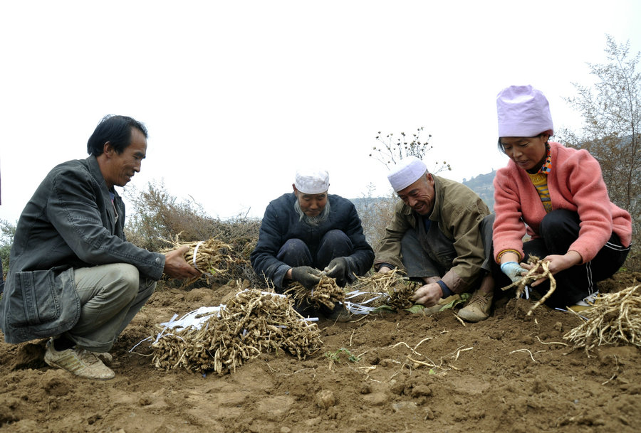 馬君說,為了讓村上的老百姓受益,我們申請成立了君益中藥材合作社。采取農(nóng)戶+合作社+公司的模式,今年從蒲家村農(nóng)戶手里以每畝300元的價(jià)錢流轉(zhuǎn)到100余畝土地進(jìn)行黨參育苗,買黨參苗子花了92500元,再以每天100元的價(jià)格雇用村民做工,從年初種苗到目前的挖苗,共支付給當(dāng)?shù)卮迕窆べY2萬余元。而今年這一百畝黨參預(yù)計(jì)能收獲二萬斤,按一斤十元錢計(jì)算,今年能賣20萬元。今年我和村主任馬曉偉共投資十四五萬了,沒有賠本,能賺個(gè)五六萬,做生意就有風(fēng)險(xiǎn)嘛,今年是個(gè)試驗(yàn),種黨參還是有錢路。明年,我們合作社將引導(dǎo)群眾自行栽種黨參擴(kuò)大種植規(guī)模。年底按合同保底價(jià)進(jìn)行回收,從中嘗到了些許甜頭的百姓紛紛表示愿意接受這種模式,黨參種植產(chǎn)業(yè)即將開啟蒲家村農(nóng)民增收致富的大門。我們種植的黨參銷售問題不用擔(dān)心,因?yàn)槲覀兒椭兴幉墓臼悄瓿跸群炗喓贤,等藥材豐收后我們開車直接送到他們藥材廠里。